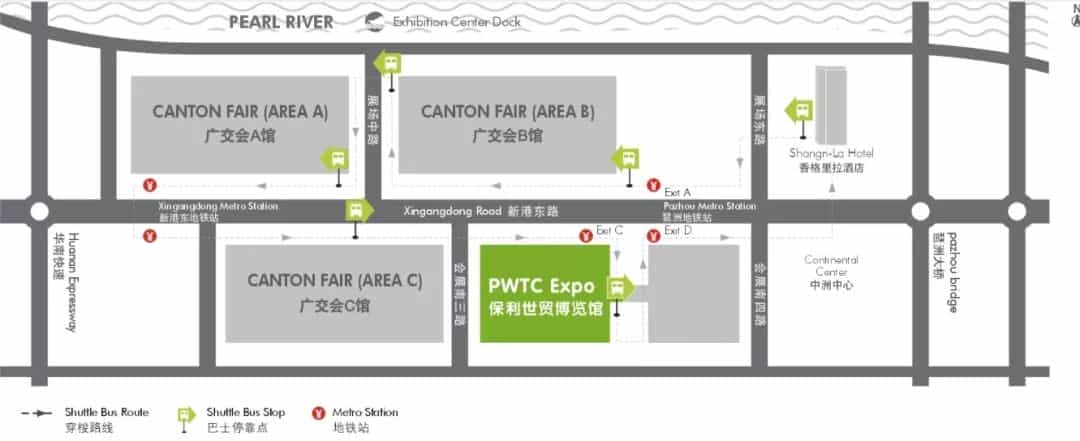 ②搭乘機場快線三號線,于“珀麗酒店”站下車,然后轉 乘地鐵8號線抵達“琶洲站”,從C出口出站直達。
