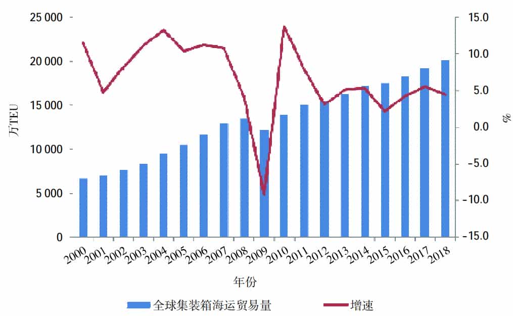 2018年全球集裝箱海運貿(mào)易出現(xiàn)小幅下滑,全年集裝箱海運量為2.01億TEU,年度增速降至4.5%,較2017年下降一個百分點。