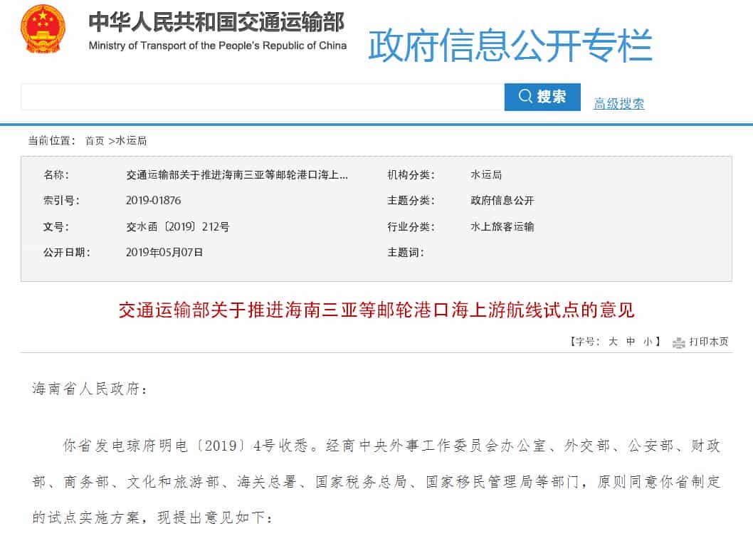 5月7日,交通運輸部發布《關于推進海南三亞等郵輪港口海上游航線試點的意見》。