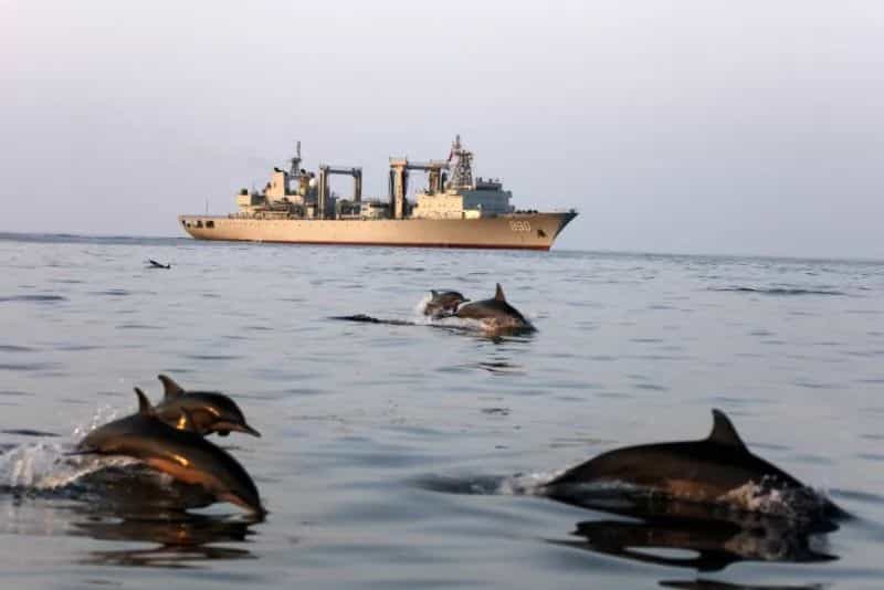 中國海軍赴亞丁灣索馬里海域護航編隊始終秉持海洋命運共同體理念,堅持人與大海和諧相處,注重生態環境保護,經常出現編隊艦艇航行時有成群海豚伴航、待機集結時有各類魚群相伴的和諧場景。