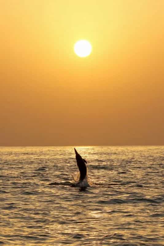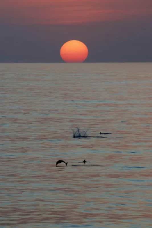 這些海豚精靈,追逐玩鬧,與軍艦競速,俏皮地在艦艏穿梭、兩舷嬉戲;一會兒如同靈動的舞者,歡騰跳躍于海天之間,騰空、旋轉,在陽光下灑落一身水花;一會兒又如同頑皮的孩子,忍不住好奇地貼近軍艦,一窺究竟。平靜的海面也因為這些海豚的穿梭,顯得格外熱鬧。這群海豚一直伴隨編隊而行,直到夕陽西落才慢慢散開。