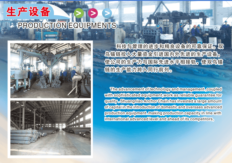 雙鳥錨鏈的產(chǎn)品遍布全球,擁有先進的生產(chǎn)設備和檢測設備,年生產(chǎn)能力達20000噸,能生產(chǎn)∮16mm-∮122mm的無檔錨鏈、二、三級船用錨鏈及附件產(chǎn)品。并且,公司先后獲得中國CCS、中國船檢局ZC、美國ABS、英國LR、日本NK、法國BV、意大利RINA、德國GL、挪威DNV、韓國KR的工廠及產(chǎn)品認可。