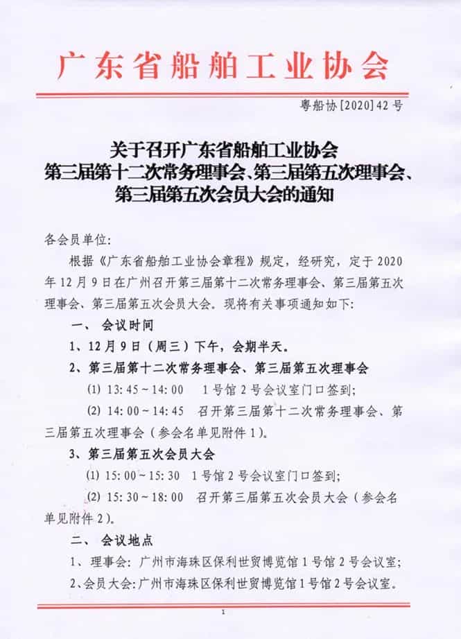 關(guān)于召開廣東省船舶工業(yè)協(xié)會(huì)第三屆第十二次常務(wù)理事會(huì)、第三屆第五次理事會(huì)、第三屆第五次會(huì)員大會(huì)的通知
