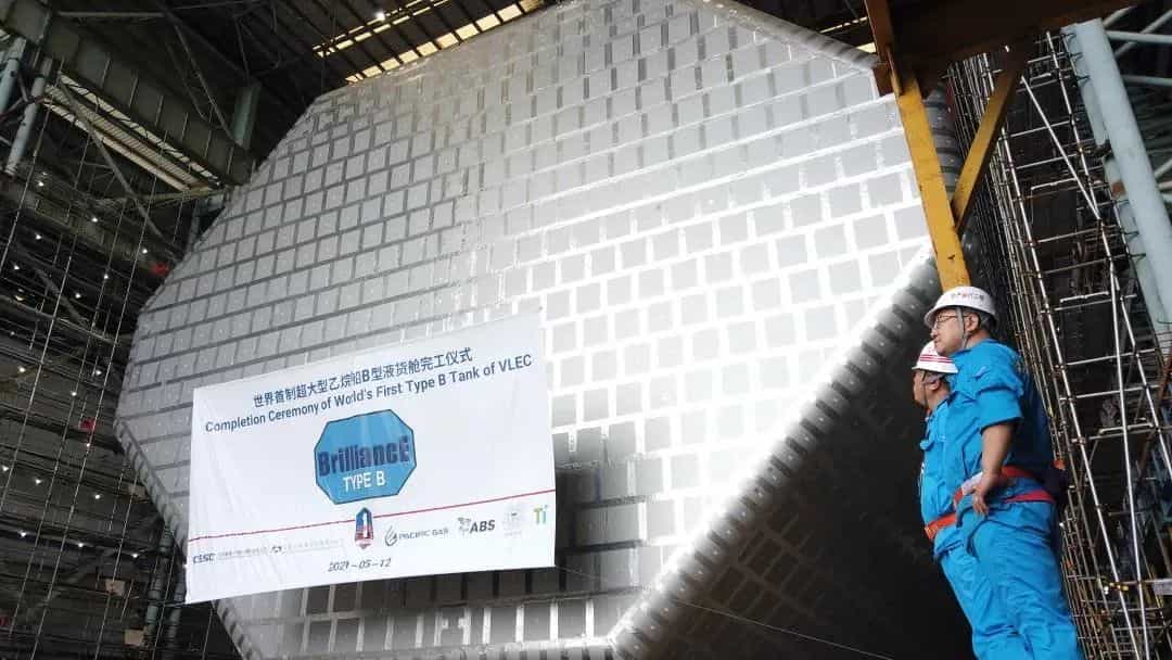 江南造船建造的全球首制99000立方米超大型液化乙烷運輸船(VLEC)最大艙容達99000立方米,是目前世界上最大艙容的VLEC船型。前不久,該型船首個B型液貨艙完工,標志著江南造船該型VLEC建造實現關鍵技術突破,其自主研發的“BrilliancE”貨物圍護系統實現了工程化和節拍化生產。