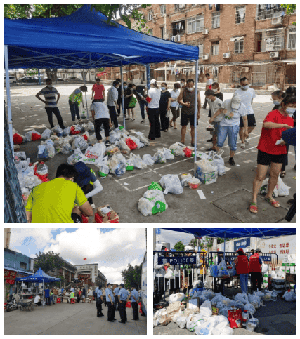 5月27日一早,中國船舶集團有限公司旗下廣州船舶工業有限公司所屬物業公司留守該小區的全部員工作為志愿者,在小區大門封閉處集合。他們有序分工,協助相關部門集中接收外賣、果蔬、日用品等,拿回小區內對居民進行分發派送。小區全員核酸檢測完成后,志愿者們還將配合對重點樓宇進行上門檢測,掌握居民一手需求。