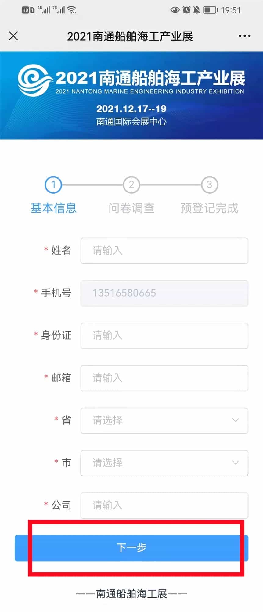 ★ 第三步:進入基本信息登記頁面,如實填寫姓名、手機號、身份證號等信息后,點擊“下一步”。