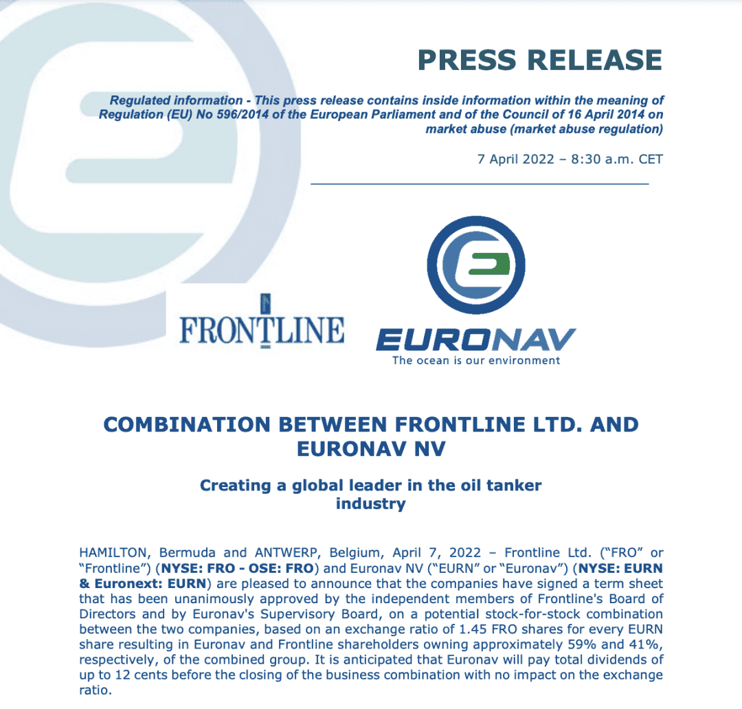4月7日,國際知名油輪船東Frontline和Euronav宣布合并。兩家通過股票置換的方式,即1.45股FRO兌換一股EURN合并成新的油輪巨頭,Euronav和Frontline股東將在合并后的公司中分別占股59%和41%。