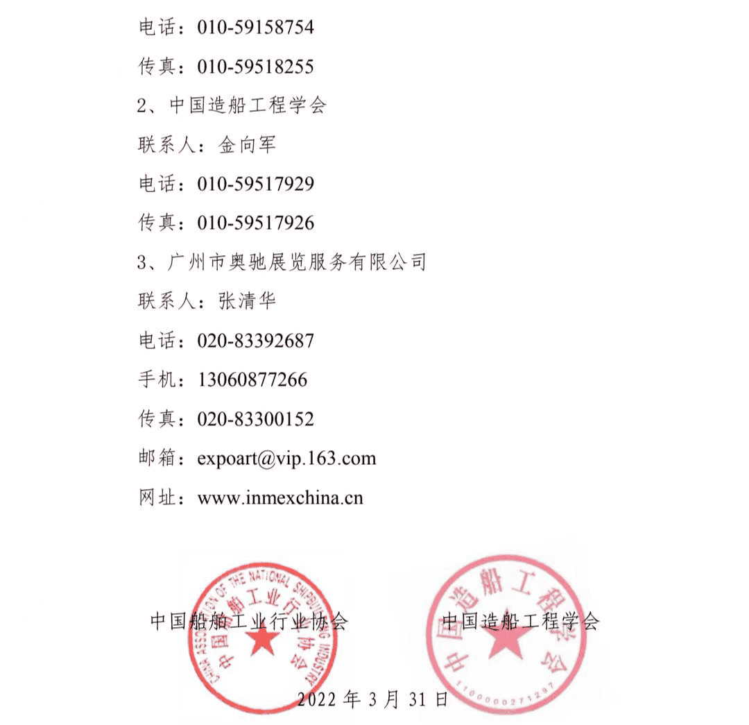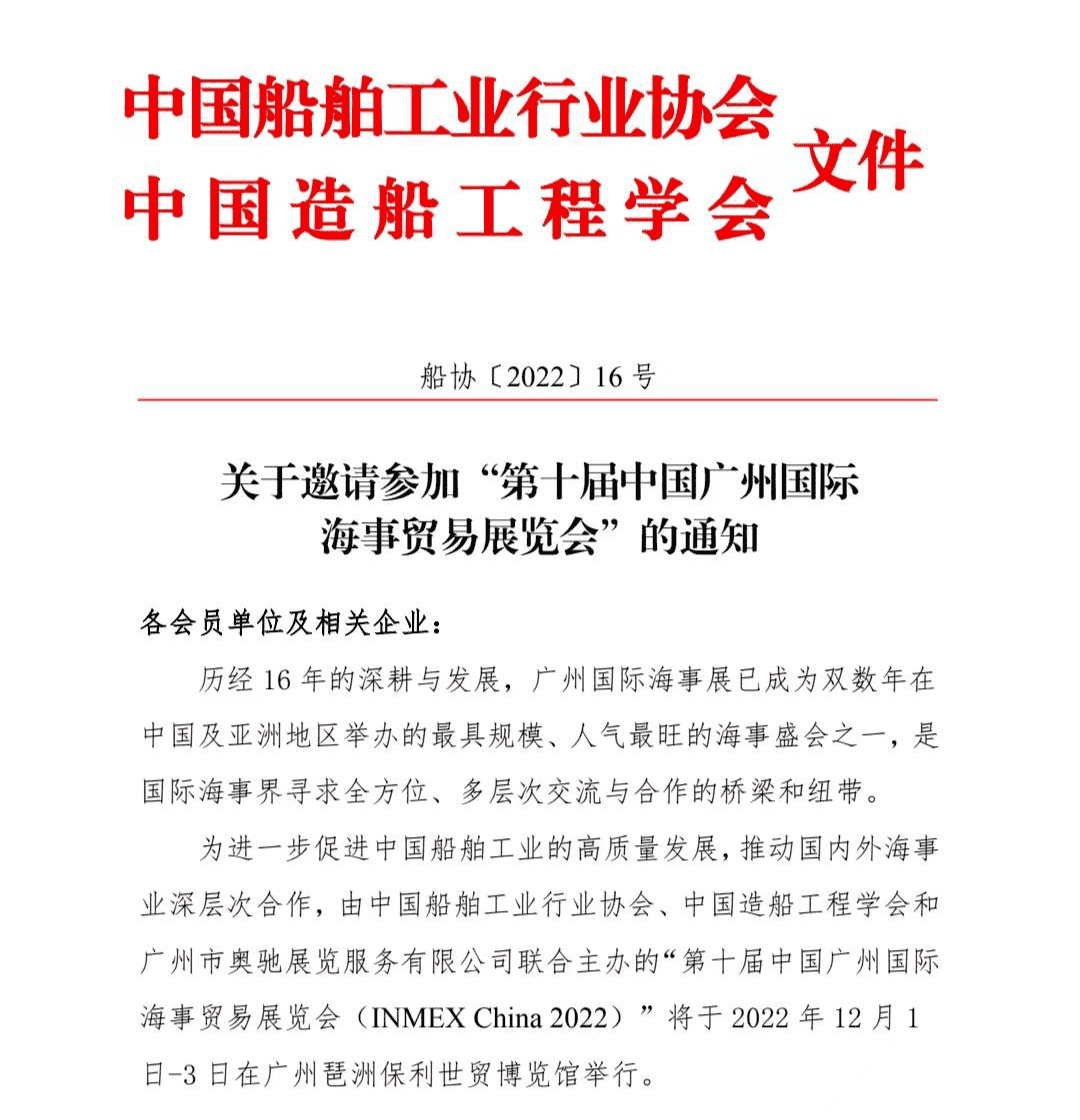 為進一步促進中國船舶工業的高質量發展,推動國內外海事業深層次合作,由中國船舶工業行業協會、中國造船工程學會和廣州市奧馳展覽服務有限公司聯合主辦的“第十屆中國廣州國際海事貿易展覽會(INMEX China 2022)”將于12月1日-3日在廣州琶洲保利世貿博覽館舉行。誠邀各會員及相關單位參展、參會!