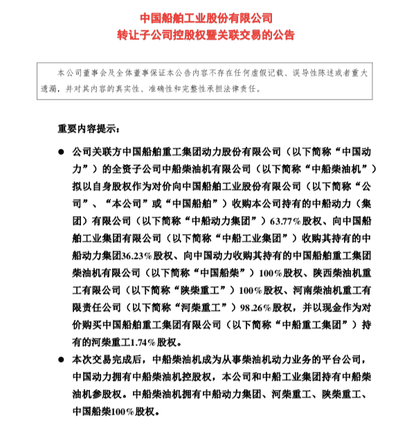公告顯示,中國動力全資子公司中船柴油機,將以自身股權作為對價,向中國動力、中船工業集團、中船重工集團及中國船舶,開展柴油機動力業務收購,總交易對價達到226.3億元。