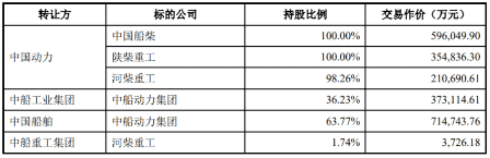 根據公告,中船柴油機向中船工業集團收購其持有的中船動力集團36.23%股權,向中國船舶收購其持有的中船動力集團63.77%股權,向中國動力收購其持有的中國船柴100%股權、陜柴重工100%股權、河柴重工98.26%股權,并以現金作為對價,收購中船重工集團持有的河柴重工1.74%股權。