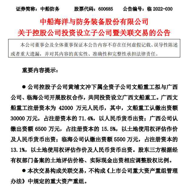 根據(jù)公告,廣西文船重工注冊(cè)資本為4.2億元人民幣,擬注冊(cè)于中國(guó)(廣西)自貿(mào)試驗(yàn)區(qū)欽州港片區(qū)。
