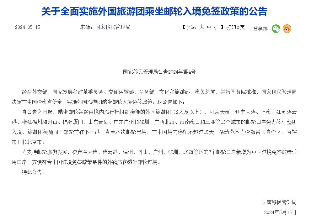 根據公告,從2024年5月15日起,乘坐郵輪并經由境內旅行社組織接待的外國旅游團(2人及以上),可從中國13個城市的郵輪口岸免辦簽證整團入境停留不超過15天。