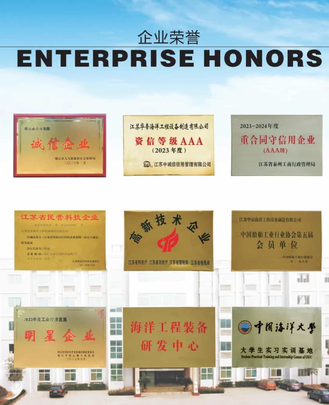 華帝海工已經取得了質量、環境以及職業健康和安全管理體系證書,同時也取得了DNV-GL、BV、LR船級社的工廠認可證書,產品分別取得了CCS、ABS、BV、DNV-GL、KR、LR、NK、RINA等船級社頒發的產品證書。