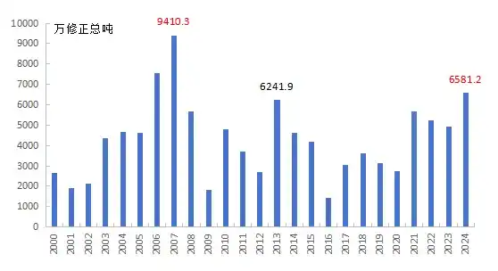 以修正總噸計,2024年全球新船訂單量已超過2013年的6241.9萬修正總噸,創2008年以來的新高。